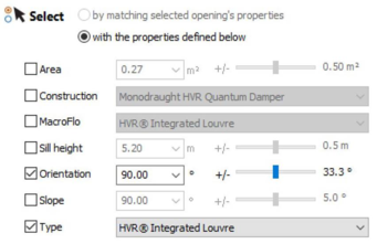 In the case of selection, you can use the Type option in combination with the existing options to fine-tune which opening(s) will be selected. For example, select all HVR Integrated Louvres at an orientation of 90°: