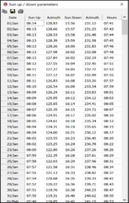This shows for each day of the year the Sunrise time and azimuth and the Sunset time and azimuth, as well as the number of daylight hours (i.e. time elapsed from sunrise to sunset).