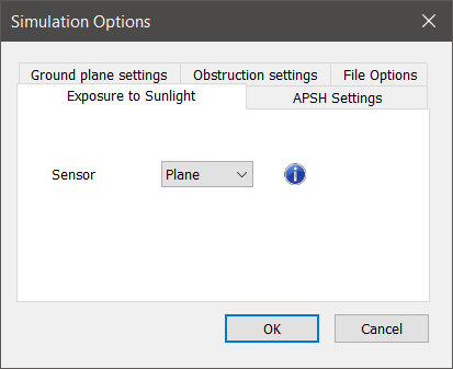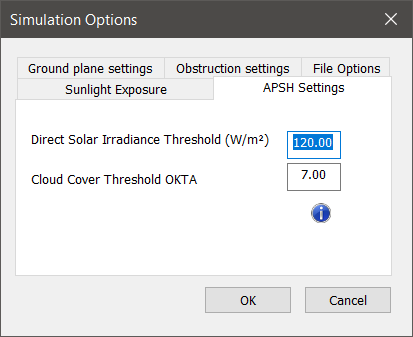 Combo-boxes allow the user to set the thresholds for Irradiance and Cloud cover for calculating APSH.