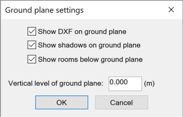 The ground plane is a virtual surface which simulates the surface on which the model is standing and onto which shadows are cast. The height (z-value) of this can be set by the user. The option to display shadows on this plane in addition to on the building, can be switched OFF, as can the display of zones below this ground level. The option Show DXF on ground plane will show an overlay of an attached DXF file on the ground plane (see ModelIT for details on attaching DXF files).