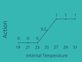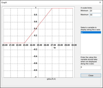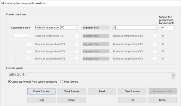 The previous two examples, “ta>25” and “ta<15”, are step function formulae. To create a control action across a range of values – a proportional band – a value must be entered in the box headed “Subject to a proportional band of”. This is best described by example. To specify a control action that starts to open a window at 23°C and modulates the degree of opening linearly until it is fully open at 27°C, proceed as follows: