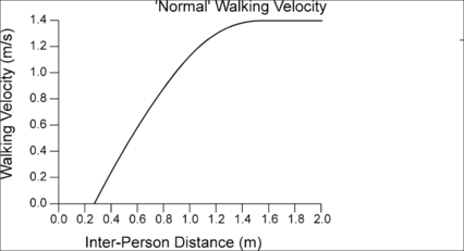 The walking velocity for a person is dependant on the forward linear distance (proximity) to people ahead. One person in front of another will reduce the velocity for the person in question, as shown in the Figure 10. Inter-person distance is defined (in this case) as the distance between the centres of the bodies of two people.