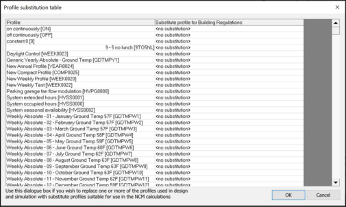The profile substitution table allows the replacement of each profile used in the standard design and simulation calculations with a substitute profile (usually but not necessarily, an NCM profile) which is suitable to be used in its place for the Apache NCM calculations within the VE Compliance application.