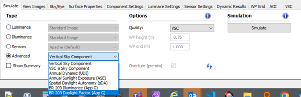 Open RadianceIES and on the simulate tab select advanced and select one of the BRE 209 Appendix G methods:
