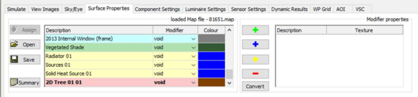 If different tree/hedge species are involved or there are other opaque components and vegetated shades in the model, click on the RadianceIES > surface properties tab.