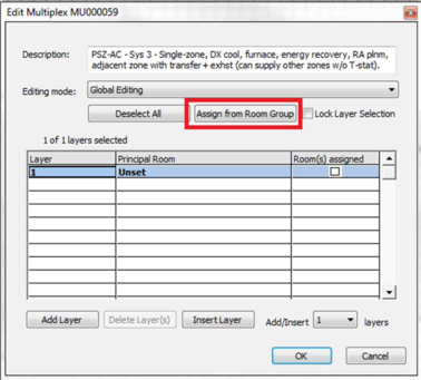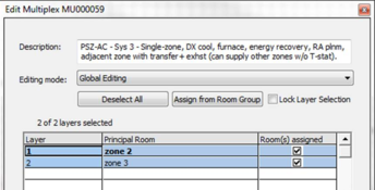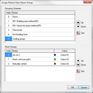 It is useful to create a grouping scheme for HVAC room assignment, with a group for each HVAC system and another group for any nat-vent rooms. This makes it easy to assign rooms to thermal templates and into HVAC network multiplexes, as described in later sections.