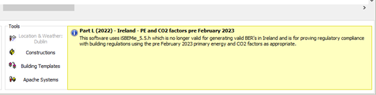 The below warning dialog is displayed in the user interface upon selection of the ‘Part L (2022) – Ireland’ route.