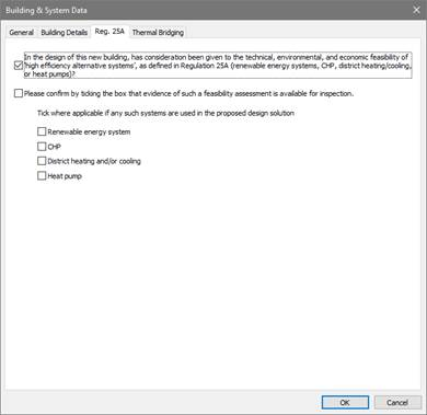 The user can confirm consideration and must provide evidence; a means to do this is provided in the Set building & system data dialog > Reg 25A tab: