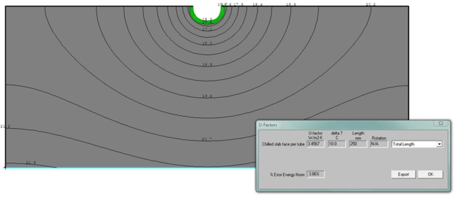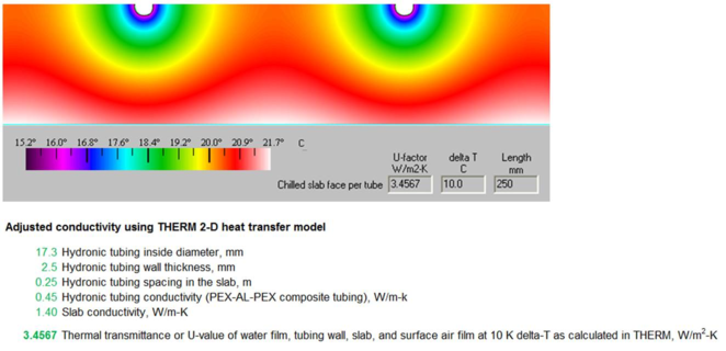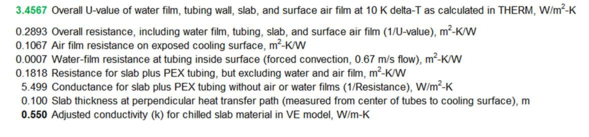 The THERM model and spreadsheet calculations above are used to determine the correct adjusted conductivity for the concrete slab or other material in which the hydronic tubing is embedded. The THERM model is relatively simple and the spreadsheet calculations are simply used to convert U-value to resistance, then subtract the resistance of the water film in the tube and air film on the exposed surface, convert resistance to conductance, and finally use this to calculate the adjusted conductivity value for the concrete material. This final number will be entered into the concrete layer of the construction in the VE and will account for the tube material, diameter, depth from the surface, and spacing within the slab.