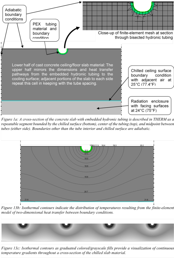 (T. Moore, May 2008; Center for the Built Environment) provides further explanation of the simple slab and hydronic tube model preparation in THERM. Following that within this appendix is a section (12.2.2) on setting up hydronic loops and controls for radiant slabs in ApacheHVAC. Additional information on both of these topics can be found in Simulation of Radiant Cooling Performance with Evaporative Cooling Sources, available from the UC Berkeley Center for the Built Environment at: