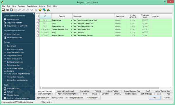 Constructions for building elements such as walls, roofs and glazing are created in the Constructions Database (CDB) utility accessible via Apache View or VE Compliance. They should satisfy the U value requirements of Criterion 2. The construction definition should include allowance for non-repeating thermal bridging, using an area-based thermal bridging coefficient. Constructions may be assigned to building elements in either Apache View or VE Compliance.