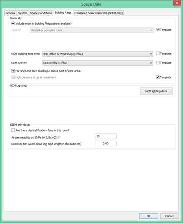 The settings NCM Building type and NCM Activity together specify the activity assigned to the room for the compliance analysis, which in turn (via the NCM Template) sets the standard conditions applied for occupancy and plant operation. While these attributes are optional in the Room Template, it is a good idea to set them there to save effort in VE Compliance.