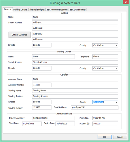 This tab takes different forms for compliance and BER generation. The screenshot below is for BER generation. For compliance the format is simpler, with the Building and Building Owner sections taking essentially the same form and the Certifier section following the form of the Building Owner section.