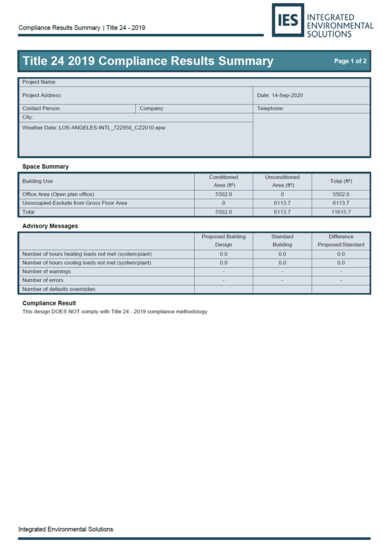 At the completion of the analysis, A summary report can be generated which shows the energy use summary for the building and each end-use in terms of Site energy (by fuel type) and kTDV. This output screen also reports a summary of unmet load hours, a compliance margin for each end-use and the whole building, and an indication of whether the building passes or fails the compliance analysis.