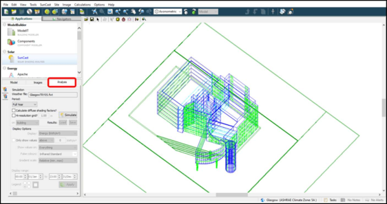 3- And an Analysis tab for visual analysis of Solar Energy and Solar Exposure on the exterior of the building using Model Viewer II. For more information, seeSection 5: The Analysis View.