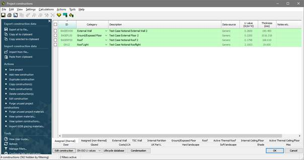 Constructions for building elements such as walls, roofs and glazing are created in the Constructions Database (CDB) utility accessible via Apache View or VE Compliance. They should satisfy the U value requirements of regulation 25. The construction definition should include allowance for non-repeating thermal bridging, using an area-based thermal bridging coefficient. Constructions may be assigned to building elements in either Apache View or VE Compliance.