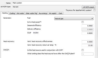 On the Apache System dialog there are other parameters that are linked with the heating and cooling system efficiencies and do not represent independently editable settings. For example, the heating system’s Generator seasonal efficiency and Heating delivery efficiency are linked to the SCoP by the relation