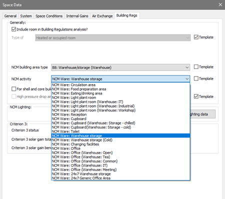 As noted above, it is recommended that the NCM activity is set as an attribute of the Room Template. This saves work as it means that the activity will be automatically set for all rooms assigned that template. An NCM activity is only meaningful in the context of a building type, so this, too, must be set in the template.