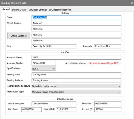 This tab takes different forms for compliance and EPC generation. The screenshot below is for EPC generation. For compliance the format is simpler, with the Building section taking essentially the same form.