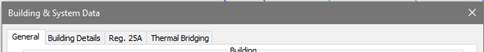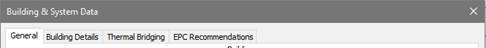 The Building & System dialog, which may be accessed either via the Building Settings menu ‘Set Building & System Data’ or via the Settings menu, allows you to enter general data relating to the building, its systems and fabric required by the BRUKL and EPC analyses and ratings calculators.