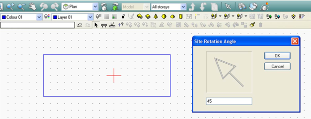 This option allows the orientation of the building to be set. The arrow points in the direction of North and adjusts when a value is entered on the input line (default position = pointing straight up). A corresponding North-pointing arrow is always visible on the Main Toolbar.