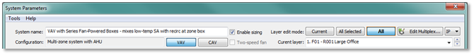 A few basis system-level parameters, including the system name, option to autosize the system, fundamental type of configuration, variable-air-volume (VAV) vs. constant-air-volume (CAV), edit mode, current layer, access to the Edit Multiplex dialog, and a toggle for IP vs SI units are provided at the top of the dialog so as to remain visible and accessible whenever the dialog is open.