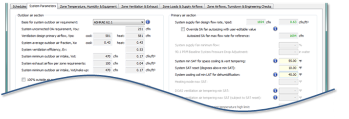 Each managed system in the ApacheHVAC file has a System Parameters dialog that provides a user-friendly means of editing and in many cases deriving its component level parameters; with user inputs alongside zone loads, sizing parameters, derived values, and engineering checks.