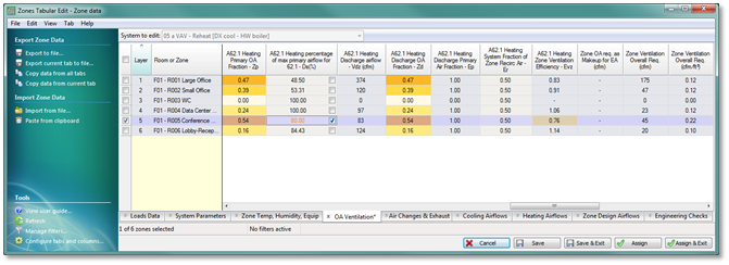 Zones Tabular Edit is a customizable spreadsheet-like dialog for viewing and editing all parameters from the System Parameters dialog (excepting only systems Schedules) for all zones on the system in a single view. This is also the means by which data can be exported for documentation or manipulation in spreadsheets, etc., and can be imported specifically with respect to editable columns of data.
