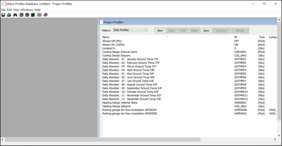When you first start ApPro in a new project you will see a list of default profiles, together with any additional profiles that have been brought into the project via templates. The ApPro facilities allow you to add to and edit these profiles so that they describe the time variation patterns required to describe events and activities in the building.