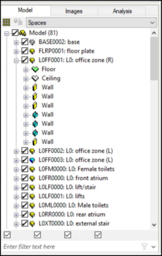 This mode has the standard Model Browser window which can be used to navigate through the model in the traditional way by selecting rooms or surfaces. Alternately, use the Up and Down buttons on a selected space within the model viewport to change the level of decomposition.