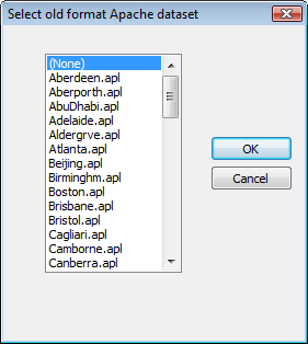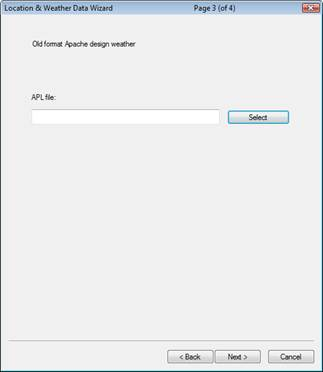 To select an old format Apache APL file choose Select and then select the required weather file from the list which appears.