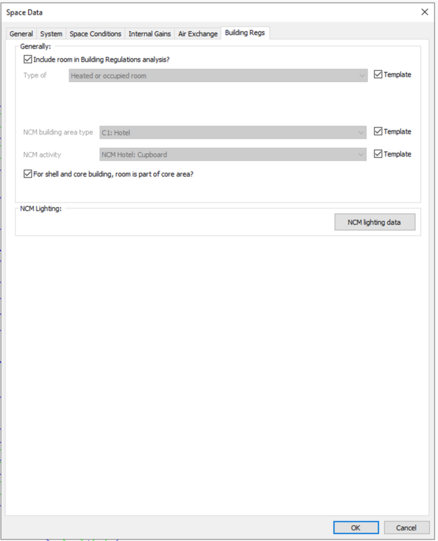 In Scotland Section 6 (2022) certain Space Data settings are under your control (via the thermal template, which may be overridden in individual rooms) and others are set automatically by the NCM template. This is explained in the context of each of the Space Data tabs in the sections which follow. A brief account of the data used to populate the various tabs appears on the tab title bar.