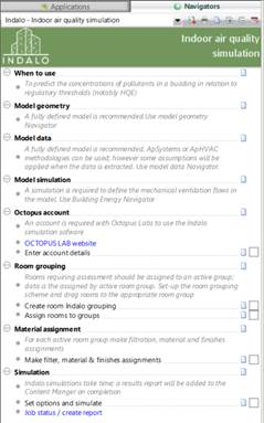 Le navigateur Indalo® peut être trouvé en accédant au panneau Navigateurs et en sélectionnant « Partenaires-> Simulation de la qualité de l'air intérieur Indalo® » dans la liste déroulante en haut du panneau. La figure 6 montre le panneau du navigateur Indalo®.