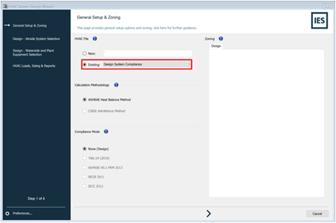 This navigator step will reopen the “HVAC System Design Wizard.” In the first step of the wizard, “General Setup & Zoning,” the HVAC file is set to “Existing,” and the user can select a pre-existing HVAC from the dropdown menu. The figure below shows this step: