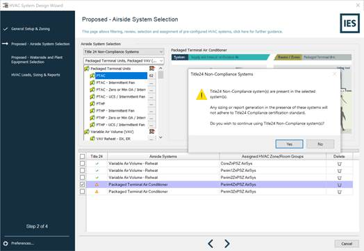 Make sure that a Title 24 compliant system is selected in step 2 of Navigator. Note that the wizard will give an error message if a Title 24 non-compliant system(s) is selected in Step 2. The figure below shows an example of a warning message when a Title 24 non-compliant system is selected.