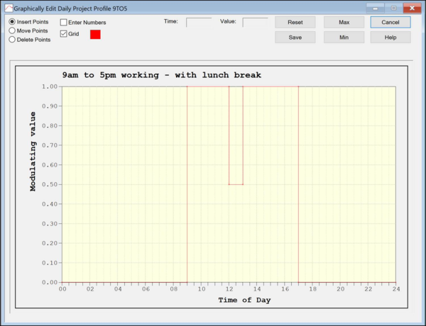 The dialogue headed Graphically Edit Daily Profile, accessed via the button on the Daily Profile editing dialogue (see previous section), enables the editing of the profile by manipulating points on a graph, as shown below: