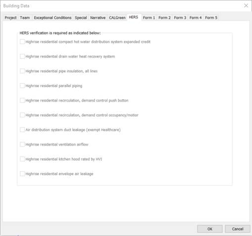 Input summary for the HERS Tab: This form indicates which HERS measures are included in the model