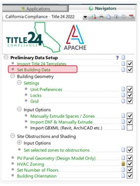 After importing the Title 24 Templates and checking its tick box, the “Set Building Data” and subsequent sections in the navigator will be visible and accessible to the user. The Set Building Data is used to set the general information about the building and the analysis in general. The Set Building Data is found in the navigator at the location highlighted in below.