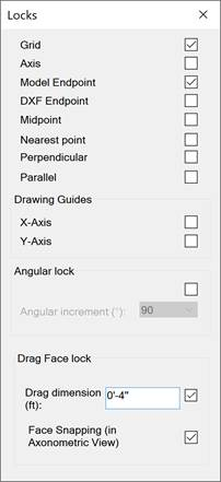 ·         Locks This allows the user to snap the drawing tool to various items in the model view window such as model endpoint, midpoint, grid... etc.  It is not recommended to use DXF Endpoint.