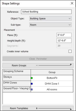 ·Manually Extrude Spaces/Zones: This will open the ‘Shape Settings’ dialog as shown below. Set the height of the room and what plane the room sits on. Draw the outline of a room by clicking on points in the model view window to define the room vertices. Rooms can also be assigned to within different grouping schemes while creating the geometry through the Shape Settings dialog.