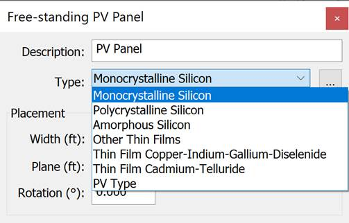 o On selection a dialog provides the user to describe the PV Panel type and define the spatial geometry and location as shown below. The user is required to place a PV Panel in the model window screen by selecting a point of placement