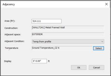 An underground wall is defined via the Adjacency toolbar button  and applying the adjacent condition of “Temp.from profile” and the Temperature Profile set to a Ground Temperature type as shown below. For additional information please refer to the Constructions Database User Guide available in the IESVE website HERE