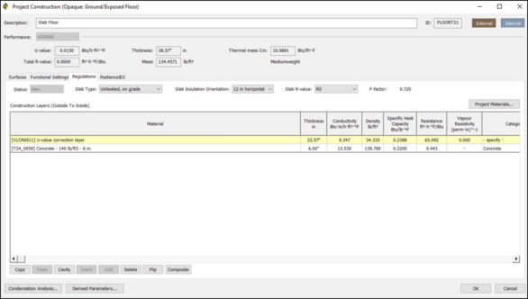 In addition a user can adjust the thermal properties of a ground-contact floor to include the impacts of the soil via a U-value correction layer. This can be set from the “Adjust” button under Functional Settings.