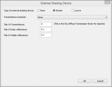 Note: both of Local shade, which defines the projections, and External shade, which defines transmittance (either constant or profiled), must be defined to complete the definition of a Title 24 shade.