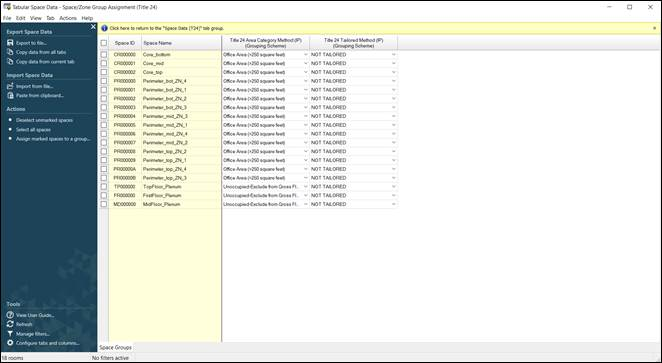 Once selected, the Tabular space data with a list of each space created in the project is displayed as shown below. The user is then required to identify the grouping scheme of each space as either based on the “Area Category Method” or “Tailored Method” as per Title 24 requirements. By default the spaces are assigned as “NOT AREA CATEGORY METHOD” & “NOT TAILORED” for each space.