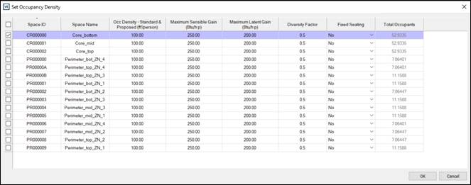 On selection the Set Occupant density dialog is opened. The user can edit the proposed occupant density, people gain and apply appropriate diversity factors to calculate the total occupants. The standard building model is assigned the same occupancy and people loads as the proposed.