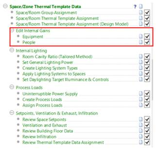 This section in the navigator is used to set and update internal gains, in the context of the Title 24 rules, from the previously imported thermal template data. The options to edit these gains can be found in the navigator under “Space/Zone Thermal Template Data” as shown below.