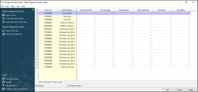 This option opens the Tabular Space Data to assign a process loads to a space as shown below.