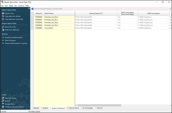 On selection the setpoint profiles can be viewed for each space through the Tabular Space Data as below, but they cannot be edited.