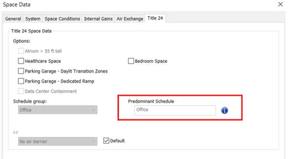 This action is taken automatically by the software but users can review the Predominant Schedule Group at any time via the Title 24 tab in space data: